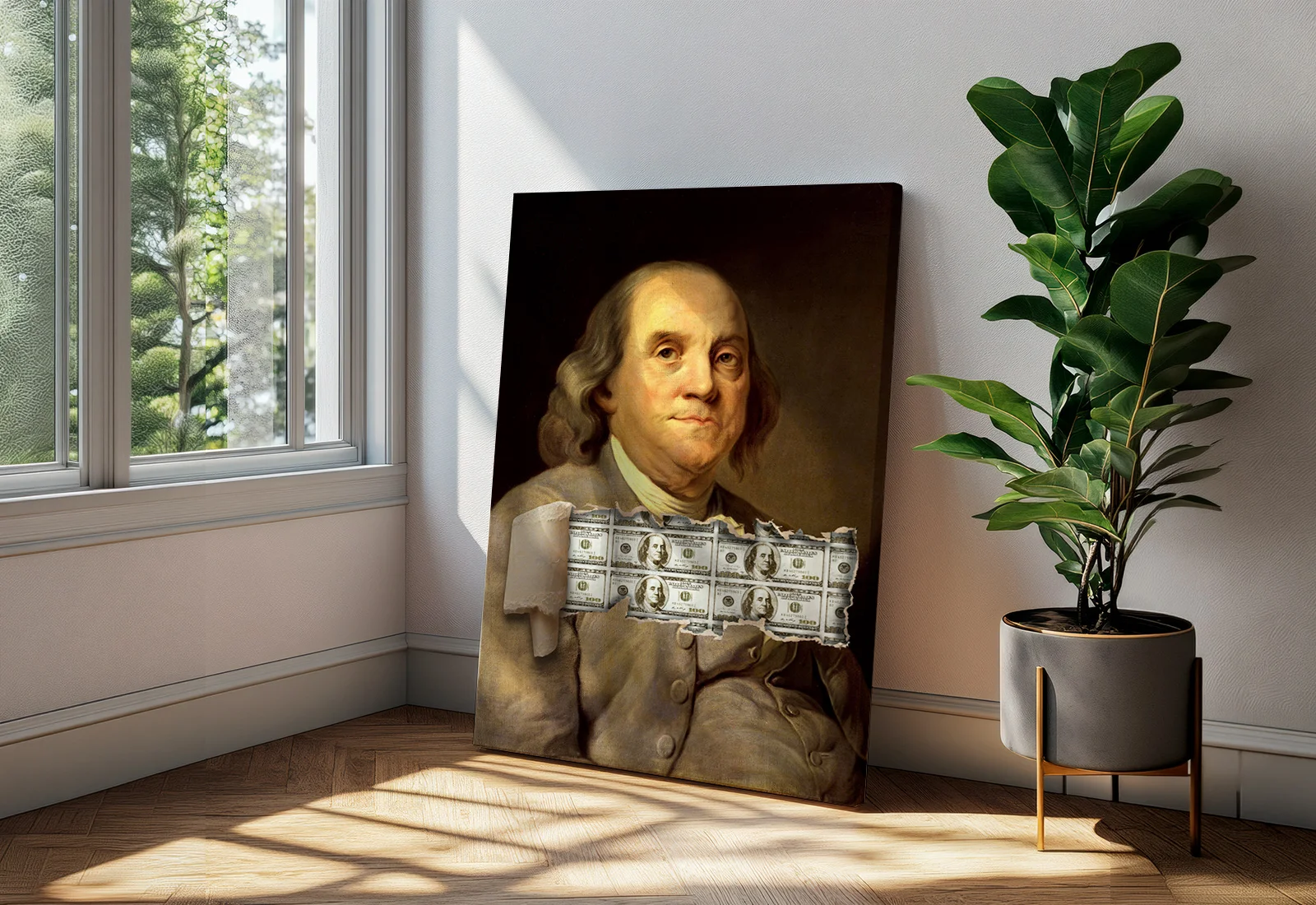 Privind această pânză, simt energia puternică a succesului financiar și a clasicului etern. Este o imprimare latex de înaltă calitate pe pânză naturală, reprezentând celebrul portret al lui Benjamin Franklin într-o interpretare conceptuală originală: prin textura "ruptă" a hainei se zăresc rânduri de bancnote de o sută de dolari.