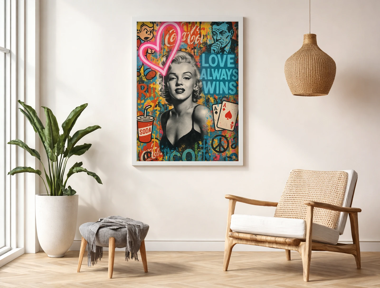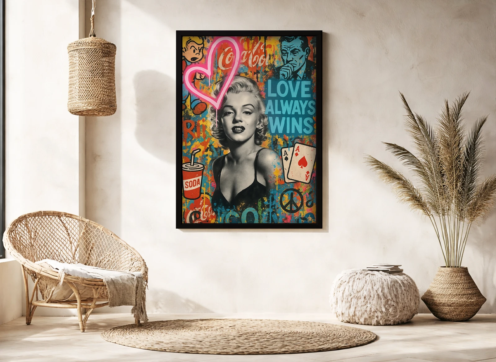 Lucrarea o prezintă pe Marilyn Monroe într-un stil pop art modern, cu elemente grafice și culori intense. Simbolurile și textul adaugă un efect urban și contemporan.