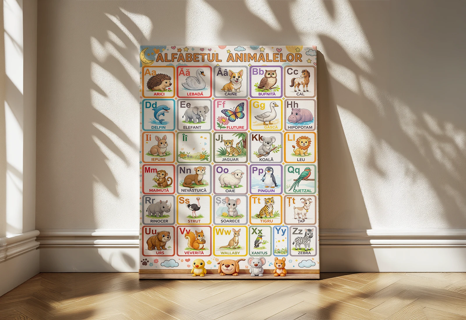 Fiecare literă este însoțită de o ilustrație veselă și clară a unui animal, de la A (Arici) până la Z (Zebra), transformând procesul de învățare a literelor într-o activitate captivantă și vizuală. Culorile vii, suculente și personajele prietenoase creează o atmosferă pozitivă în cameră, stimulând curiozitatea copilului.