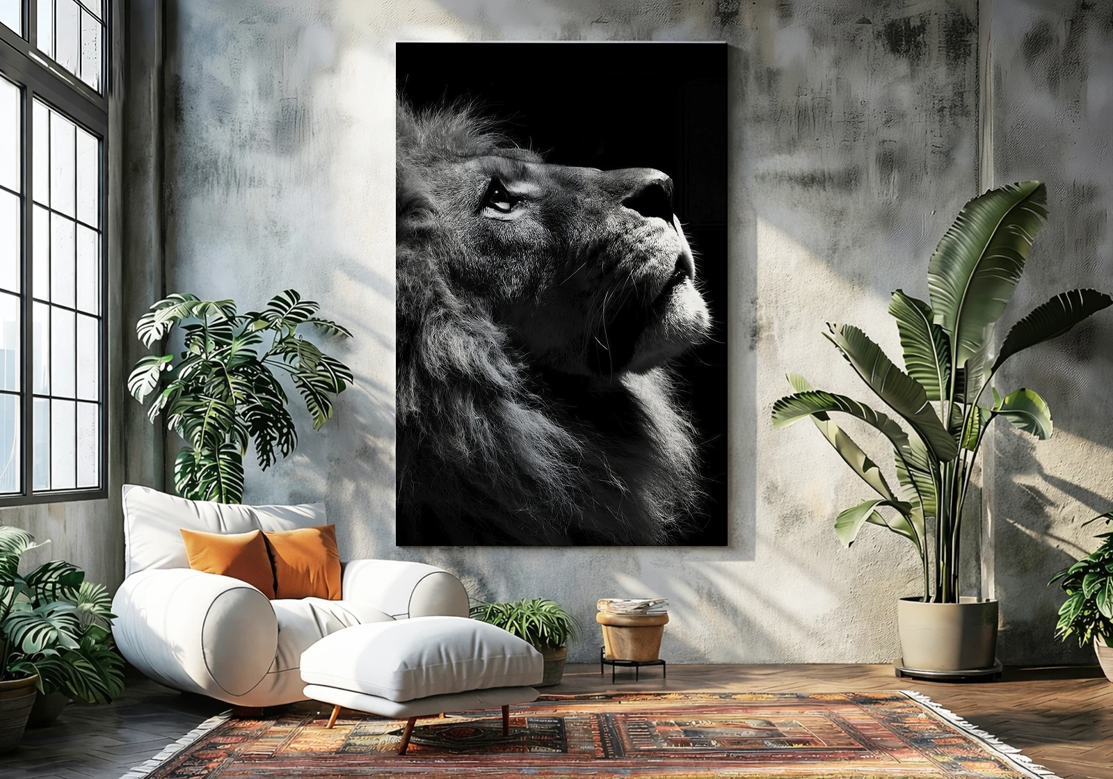 Jocul magistral de lumini și umbre subliniază fiecare detaliu al coamei dese și privirea pătrunzătoare a animalului, creând un efect de prezență și măreție nobilă. Textura densă a materialului și întinderea profesională pe șasiu transformă această imagine într-un obiect de artă de statut, care se va încadra perfect într-un interior modern de sufragerie, birou sau cabinet în stil loft sau minimalist.