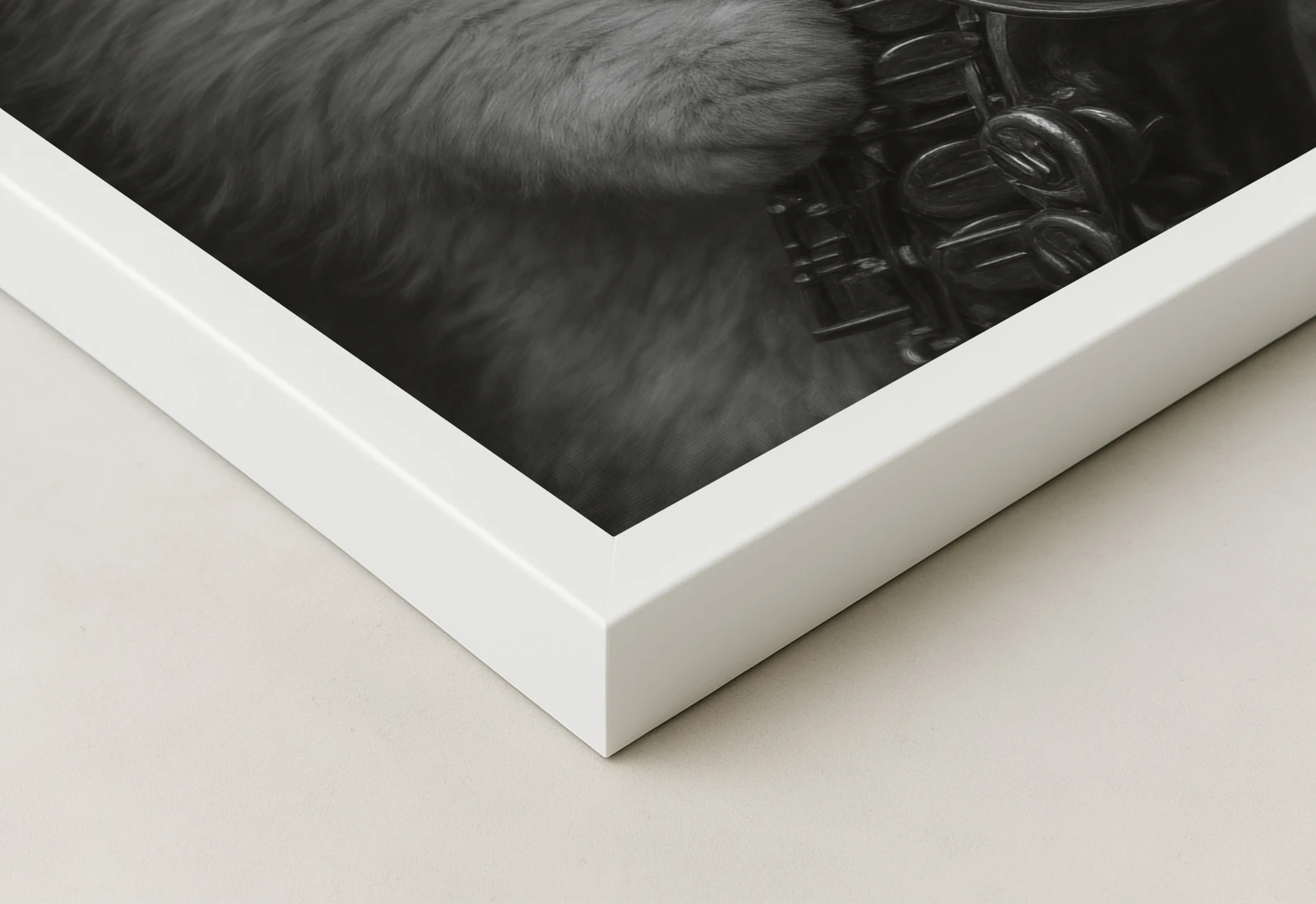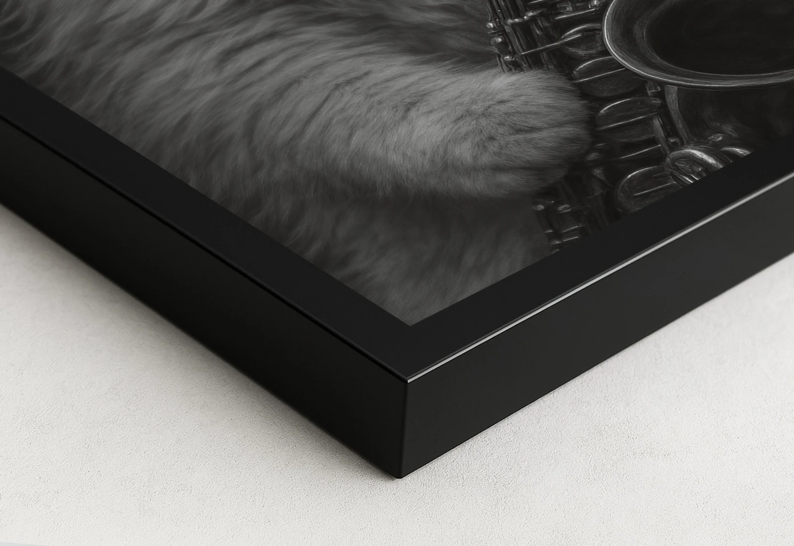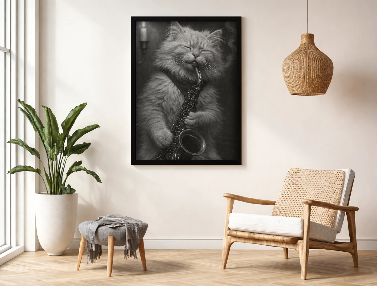 Acest tablou aduce un farmec aparte și o stare de relaxare. Pisica pufoasă cântă la saxofon cu ochii închiși, parcă pierdută în ritmurile jazzului. Contrastul alb-negru scoate în evidență detaliile și emoția momentului. Este alegerea ideală pentru un spațiu confortabil și creativ.