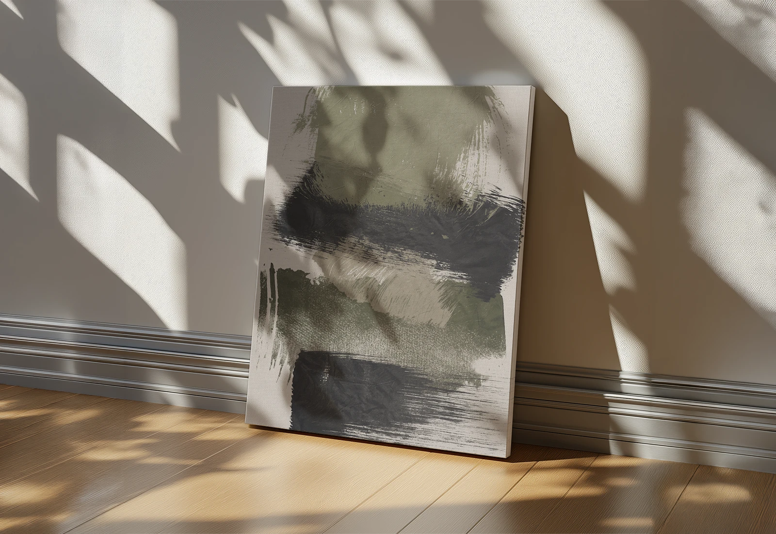 Privind această pânză, simt o energie puternică a expresiei și liniștea naturală a nuanțelor de oliv. Este o imprimare latex de înaltă calitate pe pânză naturală, reprezentând o compoziție abstractă modernă, realizată în tehnica tușelor largi și sigure de pensulă.