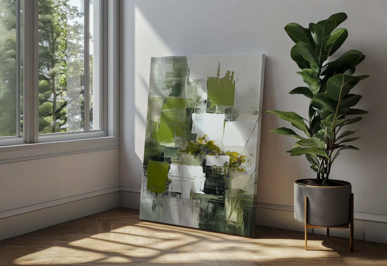 Privind această pânză, simt prospețimea unei dimineți de primăvară și jocul razelor de soare în frunzișul tânăr. Este o imprimare latex de înaltă calitate pe pânză naturală, reprezentând o compoziție abstractă luminoasă cu tușe expresive de verde, lămâie și alb.