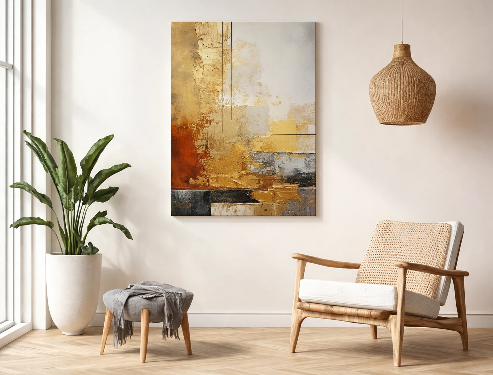 Privind această pânză, simt căldura metalelor nobile și profunzimea gândirii artistice. Este o imprimare latex de înaltă calitate pe pânză naturală, reprezentând o compoziție abstractă luxoasă în tonuri de auriu-ocru și teracotă.