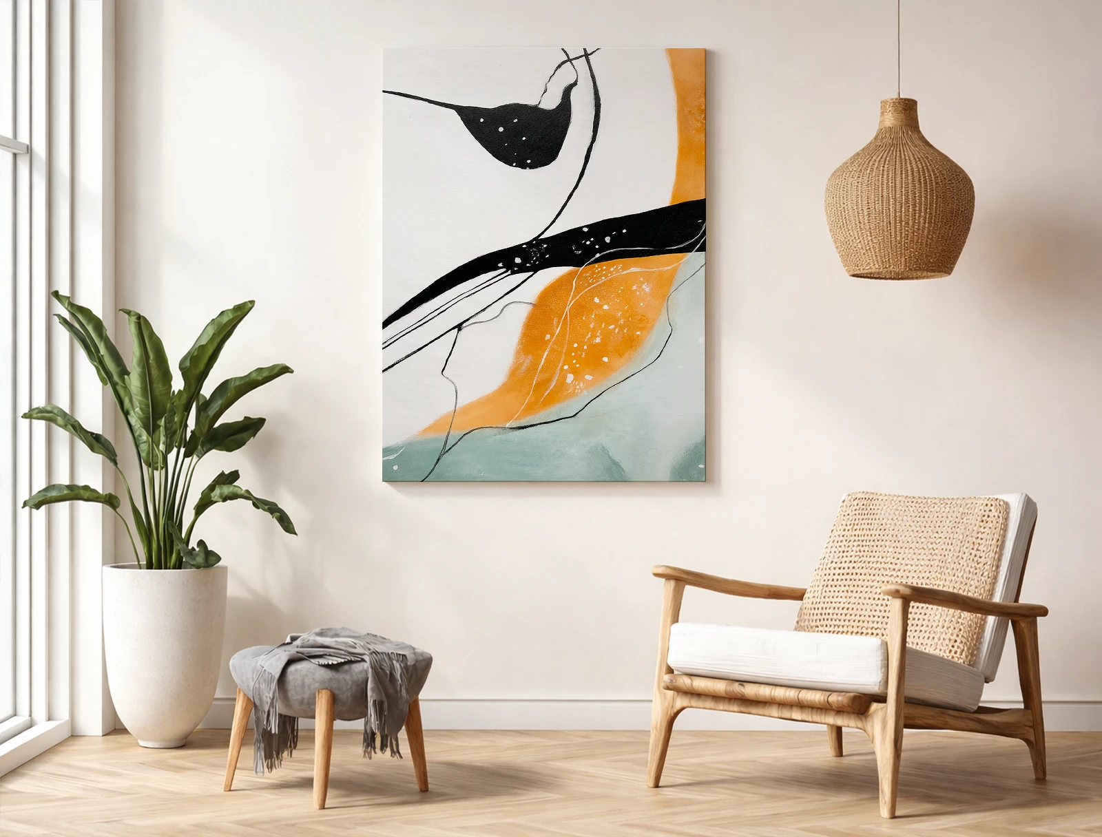 Textura densă a materialului și întinderea profesională pe șasiu transformă acest poster într-un obiect de artă modern, care se va încadra perfect într-un interior luminos de sufragerie, dormitor sau birou în stil scandi sau modern.