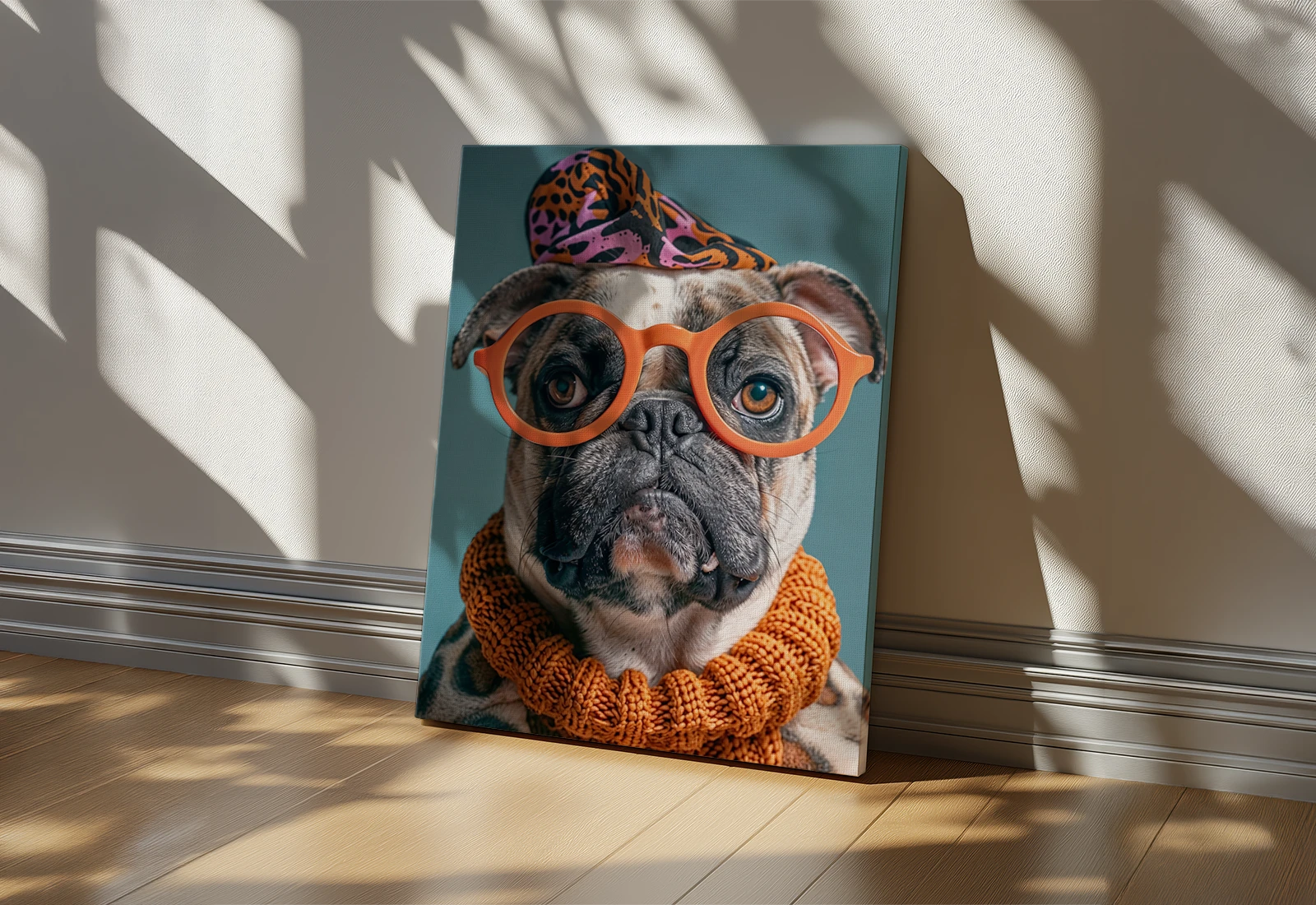 Privind această pânză, simt o doză incredibilă de pozitivism și o carismă stilată. Este o imprimare latex de înaltă calitate pe pânză naturală, reprezentând portretul amuzant și estetic al unui bulldog francez în ochelari portocalii vibranți și un fular tricotat voluminos.
