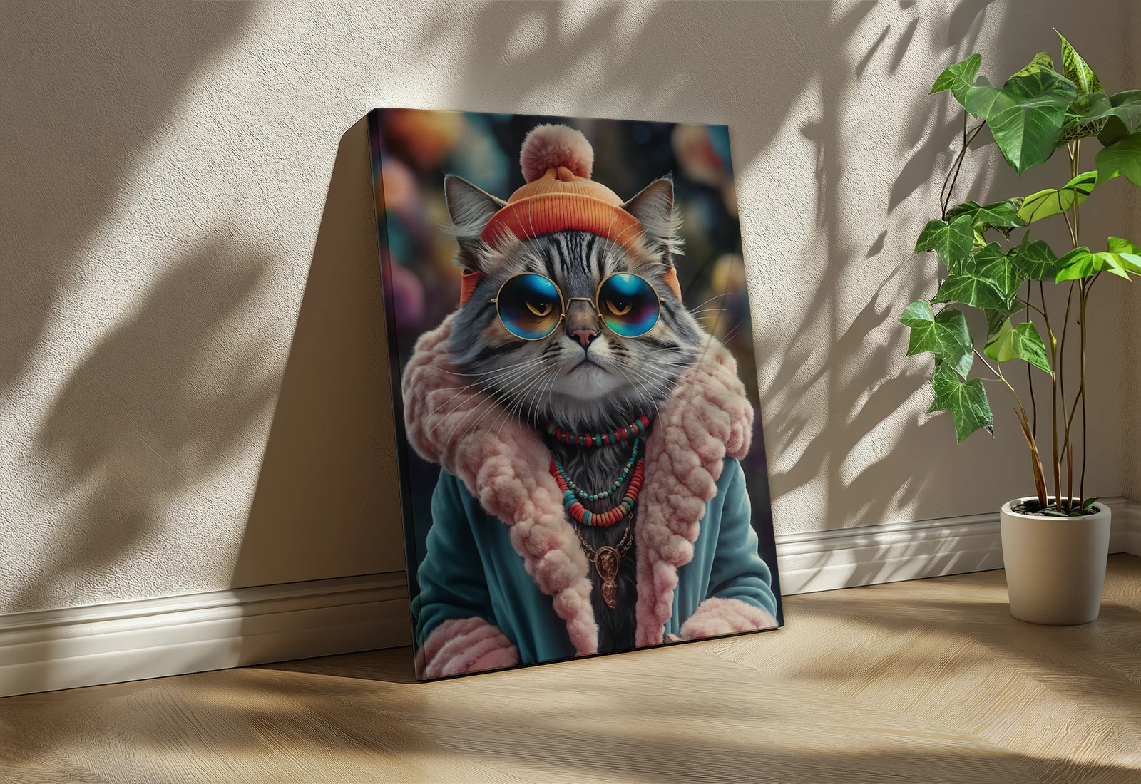 Privind această pânză, simt o explozie incredibilă de culori, îndrăzneală și șic glamour. Este o imprimare latex de înaltă calitate pe pânză naturală, reprezentând portretul carismatic al unui motan cu ochelari albaștri rotunzi, blană roz și căciulă portocalie vibrantă.