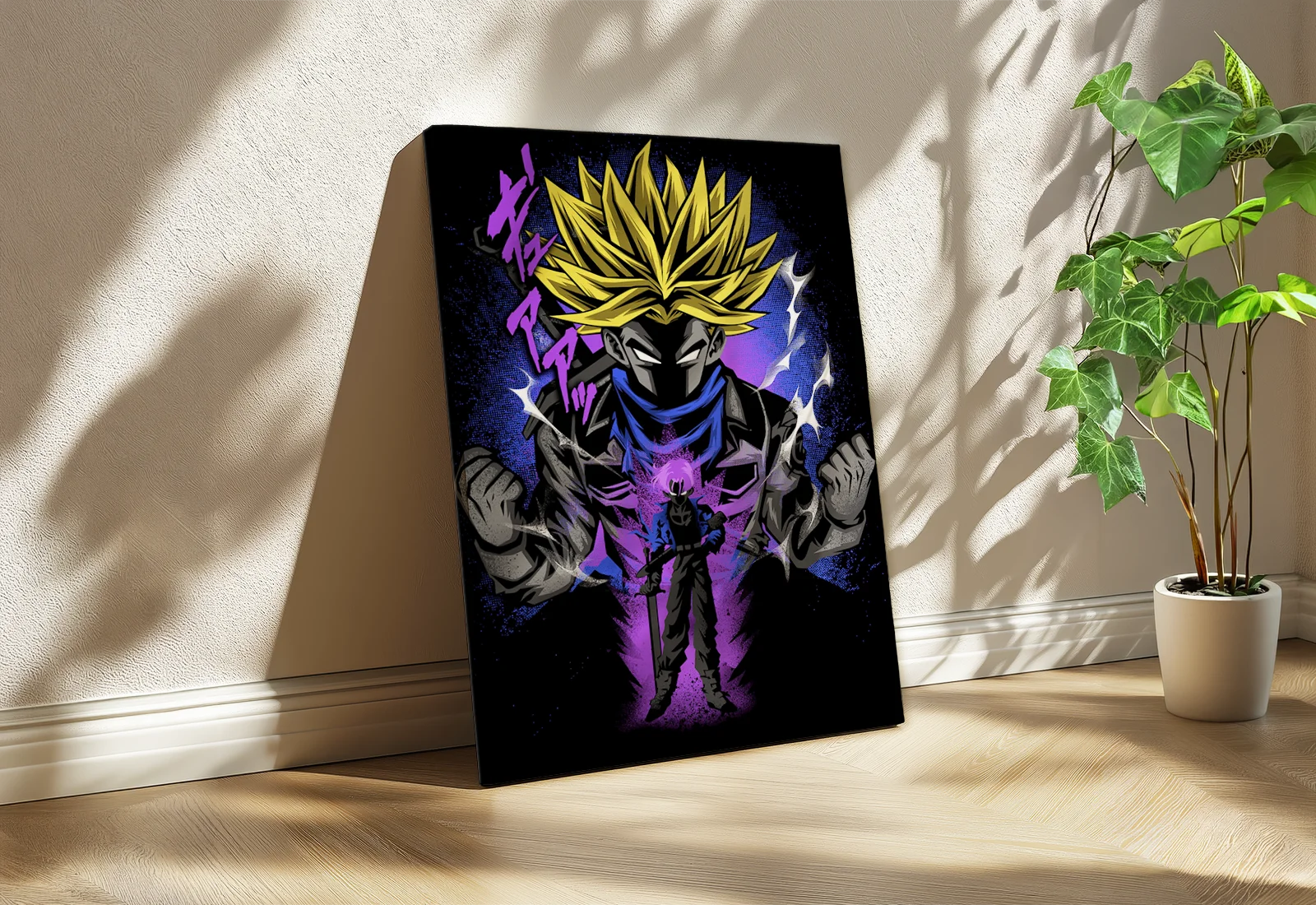 Privind această pânză, simt o energie de luptă incredibilă și determinarea apărătorului viitorului din universul Dragon Ball. Este o imprimare latex de înaltă calitate pe pânză naturală, reprezentând un art epic cu Trunks în forma Super Saiyan.