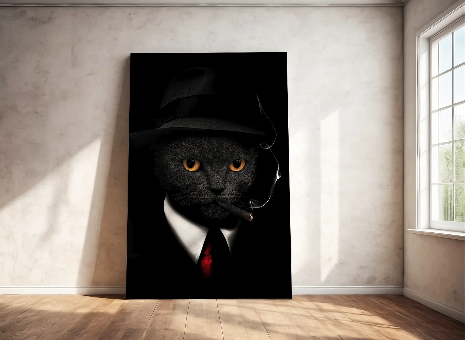 Privind această pânză, simt atmosfera filmului noir, a puterii și a imperturbabilității feline. Este o imprimare latex de înaltă calitate pe pânză naturală, reprezentând un portret stilat al unei pisici negre purtând o pălărie clasică, cămașă albă și cravată, cu un trabuc aprins.