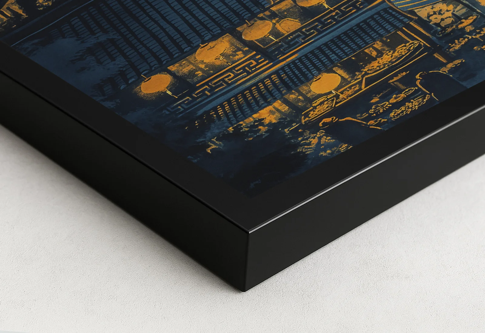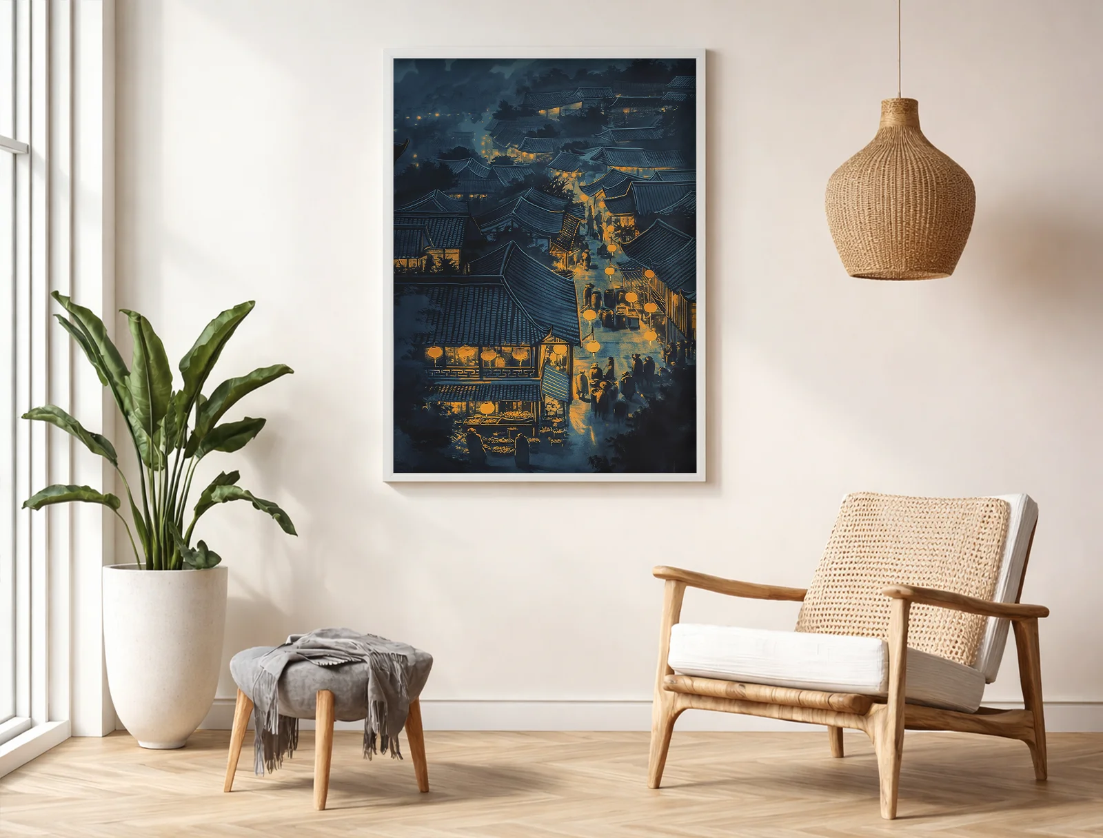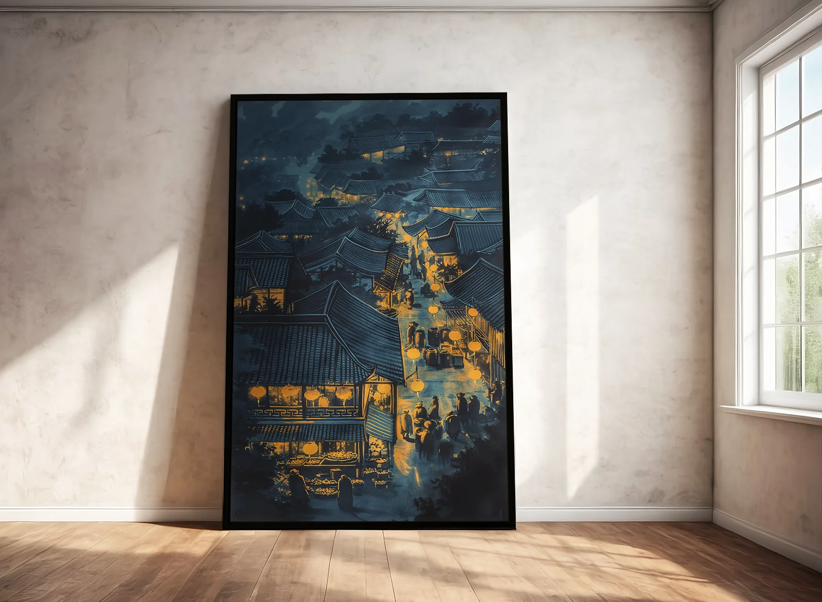 Privesc acest tablou ca pe o scenă de seară într-un oraș asiatic, unde străzile sunt luminate de felinare calde. Contrastul dintre albastrul profund și lumina aurie creează o imagine plină de viață și echilibru.
