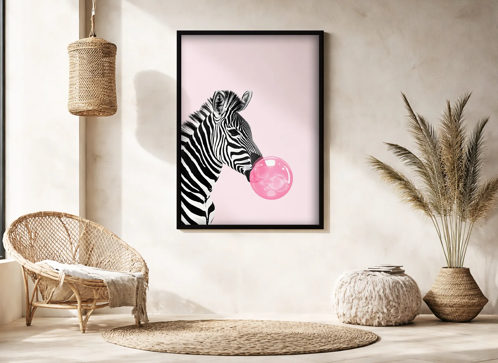 Privesc acest tablou ca pe o combinație de umor și stil, unde o zebră devine personaj principal într-o scenă modernă. Balonul roz adaugă un contrast puternic și atrage imediat atenția, în timp ce liniile alb-negru oferă claritate și echilibru.