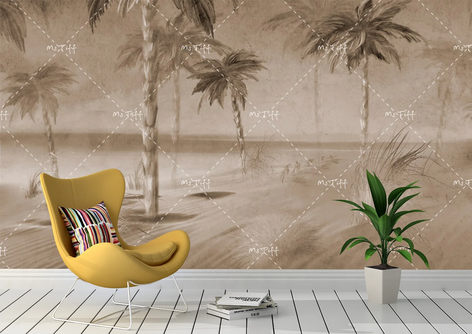 Fototapetul cu palmieri în nuanțe calde de nisip aduce un aer tropical discret și elegant. Designul minimalist și culorile naturale creează un ambient liniștitor.