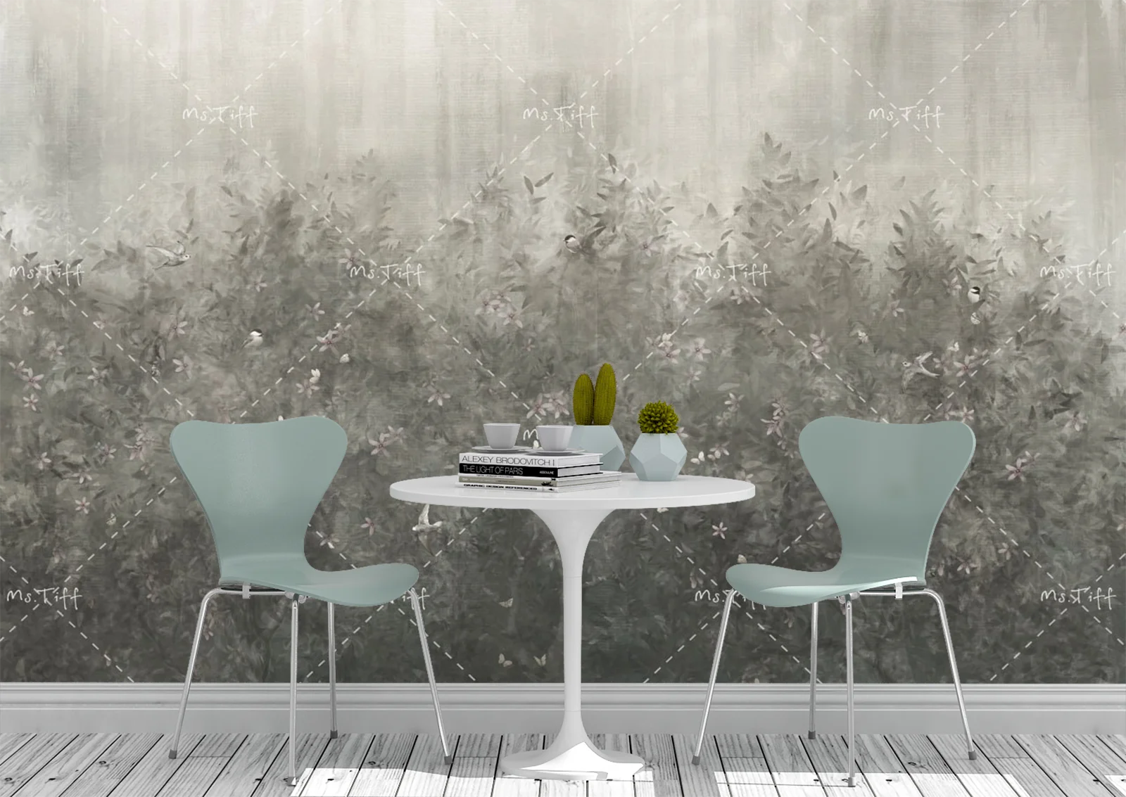 Fototapetul cu ceață de pădure și flori delicate oferă un decor elegant și echilibrat. Tonurile neutre și detaliile fine creează profunzime și calm.