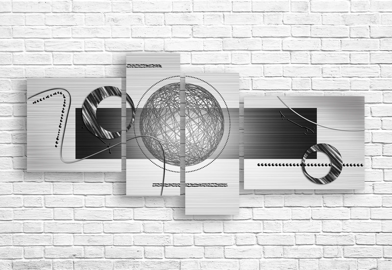Paleta cromatică neutră, bazată pe gri, negru și accente metalice, permite integrarea ușoară a tabloului în livinguri, birouri, dormitoare sau spații comerciale. Structura modulară amplifică impactul vizual și adaugă profunzime decorului.