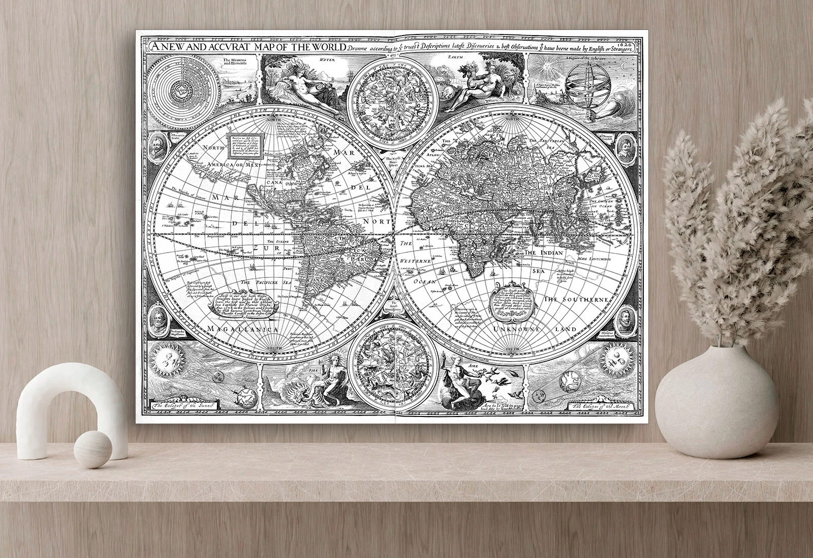Descoperă epoca marilor explorări geografice cu această hartă antică a lumii, imprimată pe pânză în stil alb-negru. Compoziția detaliată, împărțită în două secțiuni, oferă o viziune istorică unică asupra continentelor și oceanelor. Înconjurată de elemente decorative, ilustrații astronomice și inscripții vechi, această piesă va deveni punctul central al oricărui interior. Perfectă pentru birouri, biblioteci, săli de așteptare, cafenele și birouri de acasă. Printul de înaltă calitate pe pânză garantează detalii bogate și o imagine durabilă. O alegere ideală pentru iubitorii de artă istorică, cartografie și design clasic!